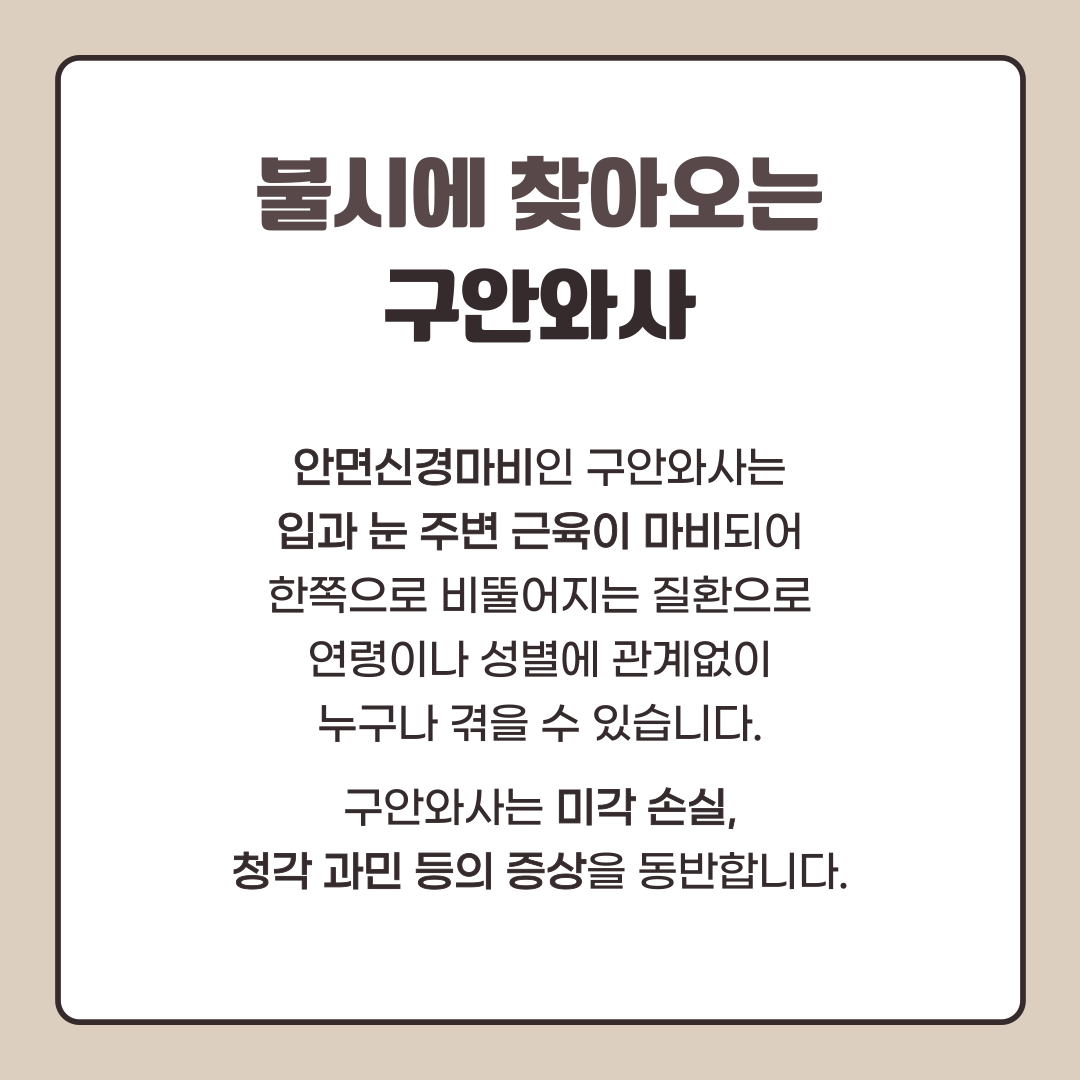 갑자기 구안와사가 발생했을 때 초기에 확실하게 대응할 수 있도록 하는 것이 중요합니다.